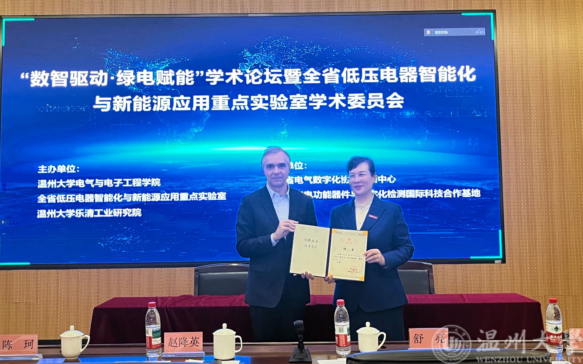 会议同时举行了丹麦技术科学院院士、浙江大学浣江实验室微电网研究中心主任Josep. M. Guerrero教授的荣誉教授聘任仪式。赵降英为Guerrero院士颁发了聘书。Guerrero院士是全球微电网和可再生能源领域的顶尖学者,此次合作,将进一步推动温州大学电气与电子工程学院和全省重点实验室在国际合作与对外交流能力的提升。