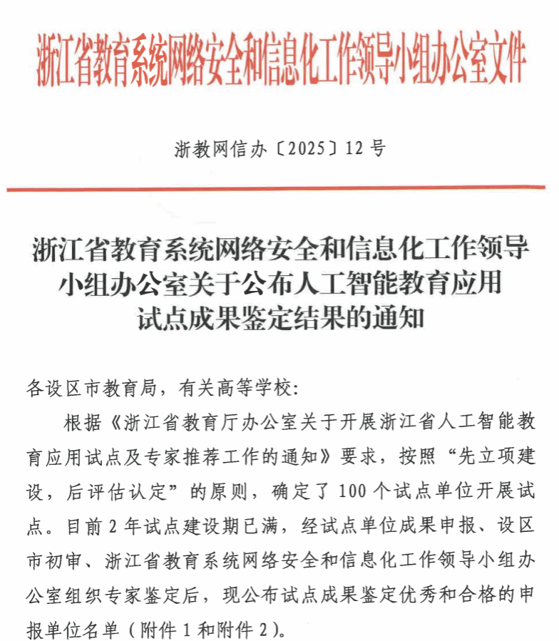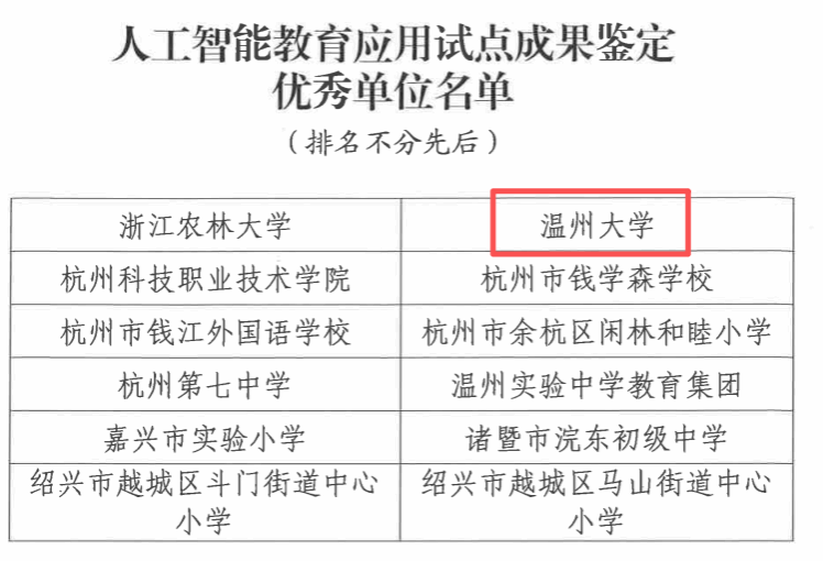 近日,浙江省教育系统网络安全和信息化工作领导小组办公室正式公布人工智能教育应用试点成果鉴定结果,温州大学凭借在人工智能与教育融合领域的突破性探索与显著成效,成功获评优秀单位。此次全省仅2所本科高校获此殊荣,标志着学校在人工智能教育应用创新实践中迈出关键一步。