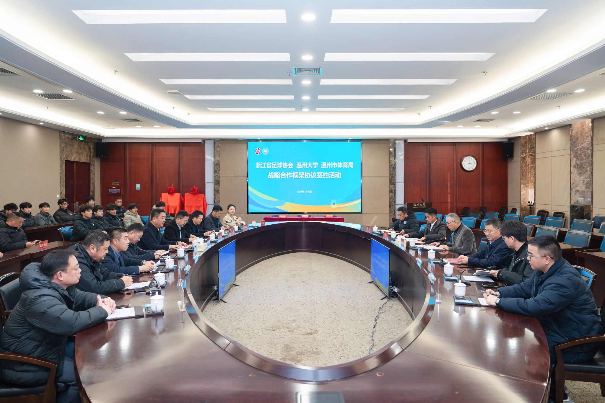1月12日,我校与浙江省足球协会、温州市体育局战略合作框架协议签约仪式在温州大学南校区岩松堂举行,三方正式为“浙江省足球协会青少年足球人才培养基地”与“浙江省足球协会教练员裁判员培训基地”揭牌。浙江省足球协会主席夏海伟,温州大学党委书记钱强,浙江省足球协会常务副主席陆翔,温州大学副校长王尧骏,温州市体育局党组成员、副局长杜继正出席本次活动,浙江省足协代表、温州市体育局处室负责人,温州大学相关职能部门负责人、体育与健康学院全体班子成员及足球运动专业师生代表到场,共同见证签约、揭牌仪式。