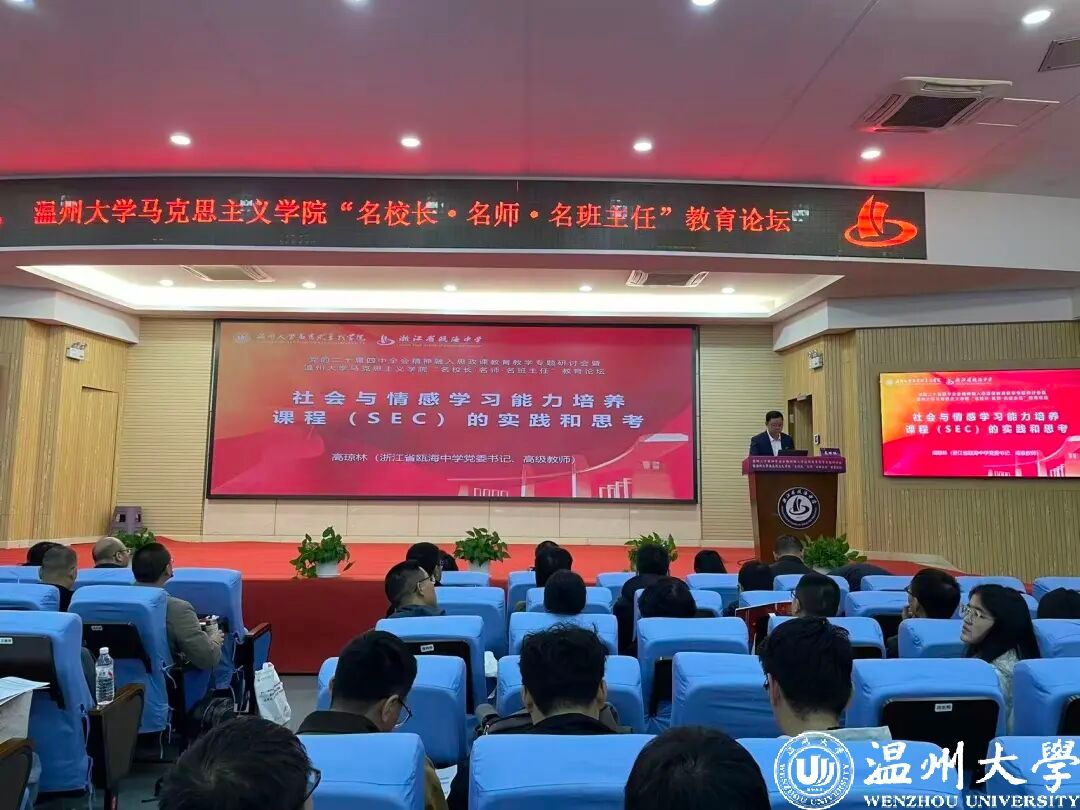 为深入学习贯彻党的二十届四中全会精神,推动党的最新理论融入思政课建设,推进大中小学思政教育一体化建设,搭建高校马院与中小学协同育人的平台,11月29日,党的二十届四中全会精神融入思政课教育教学专题研讨会暨温州大学马克思主义学院“名校长·名师·名班主任”教育论坛在瓯海中学举行。