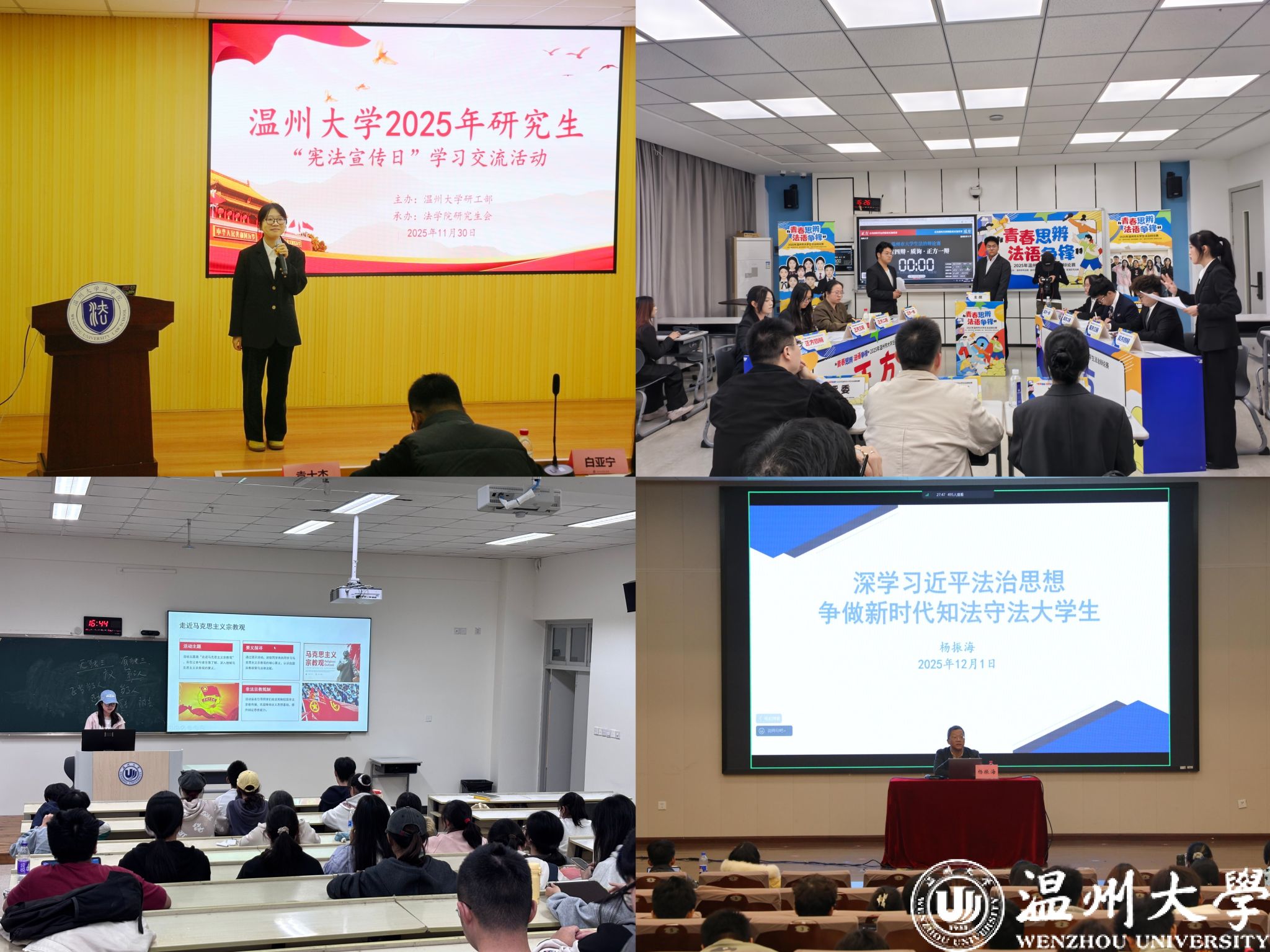 此外,温州大学还陆续开展了法治辩论赛、学习交流会、主题团日活动、形势政策课、普法进社区等活动,从干货满满的学习交流会到思维碰撞的辩论赛,从社区、校园普法到国旗下的庄严宣誓,内容丰富、形式多元,通过多种形式落实法治进校园,让尊法、学法、守法、用法的理念在青春校园里深深扎根。