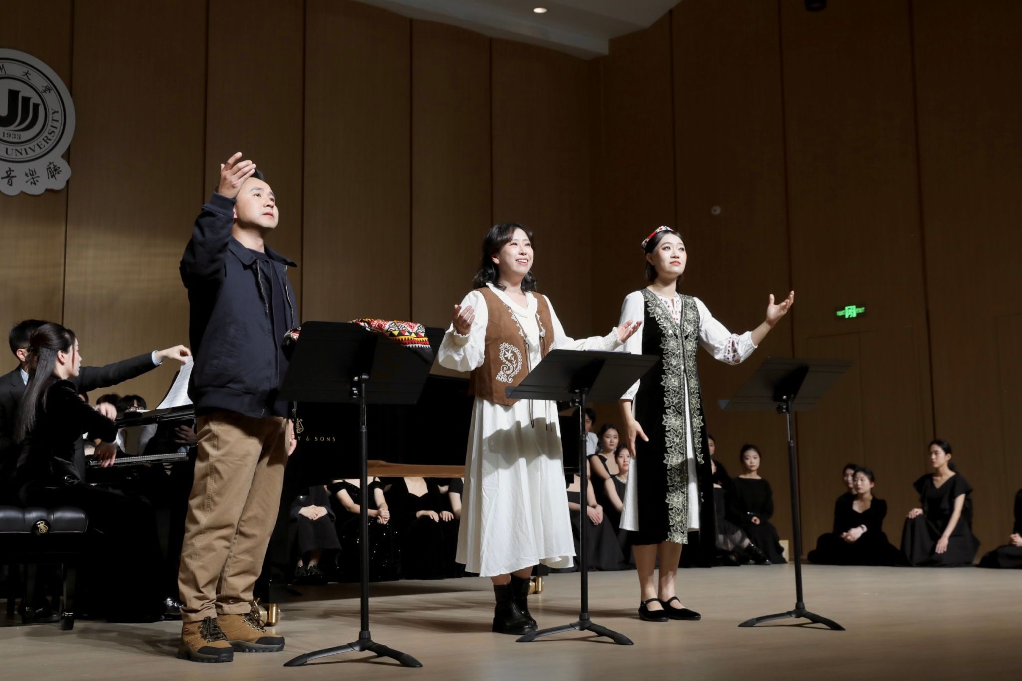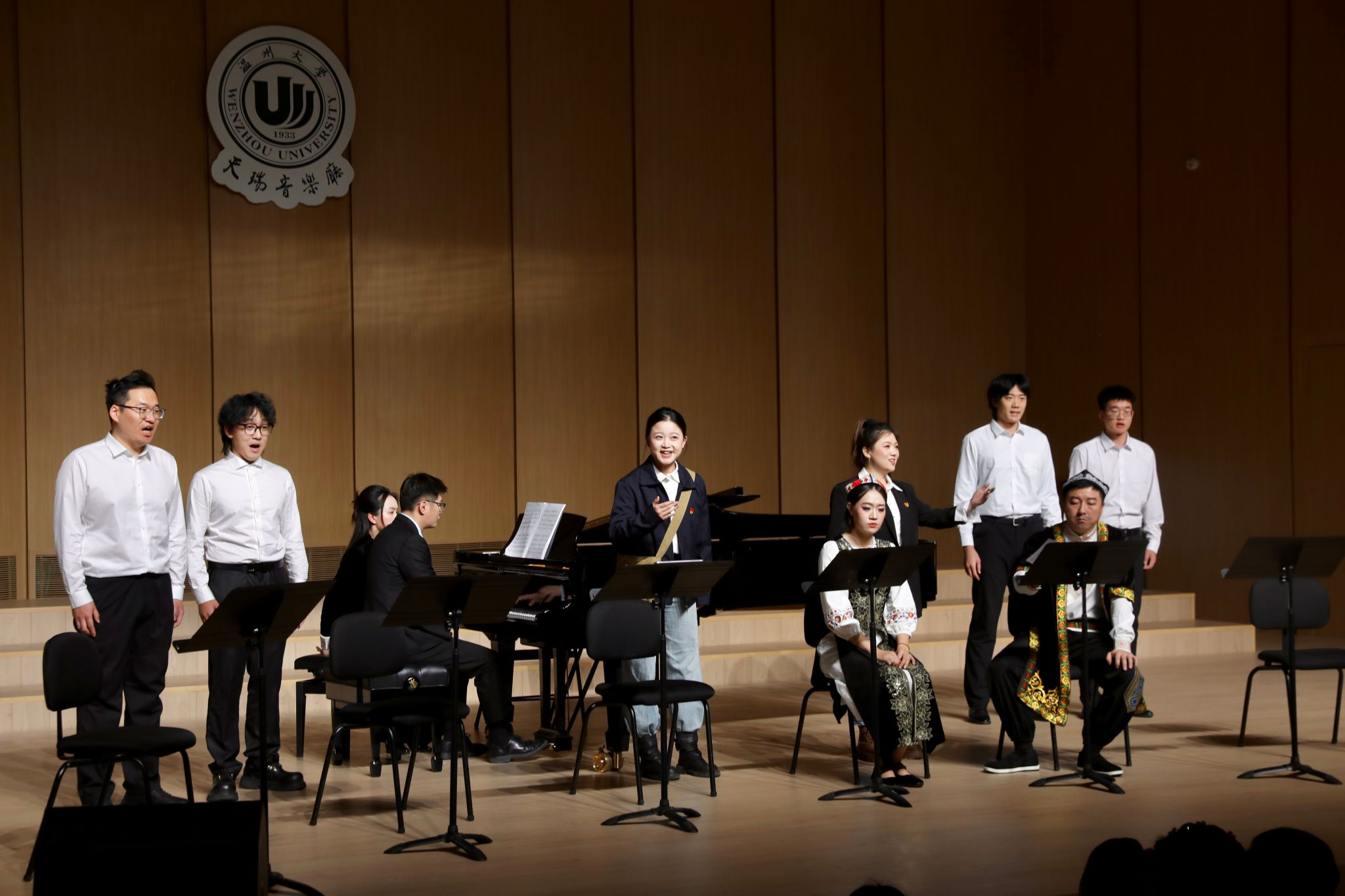 本次音乐会版首演由温州大学音乐学院组织140余名师生共同完成。在声乐系主任叶文辉教授的指挥下,声乐系骨干教师与优秀学生以饱满的热情全情投入,将这部融合东西部音乐语汇、承载深沉情感的作品精湛呈现。参演师生纷纷表示,此次演出不仅是一次专业实践,更是一次精神洗礼。饰演援疆干部刘双双的声乐副教授李合胜表示:“这个角色是连接浙新两地、促进民族情感交融的桥梁。在创作过程中,我一次次被两地人民在日常相处中积累的真诚与信任深深感染。”