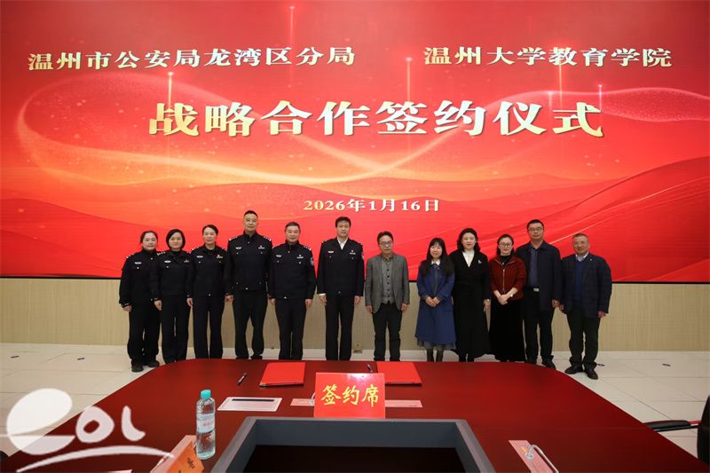 1月16日,温州大学教育学院与温州市公安局龙湾区分局战略合作框架协议签约仪式顺利举行。龙湾区副区长、区公安分局党委书记、局长叶辉,温州大学教育学院院长李长吉出席仪式并讲话。龙湾区公安分局、温州大学教育学院等相关领导及双方代表参加活动。