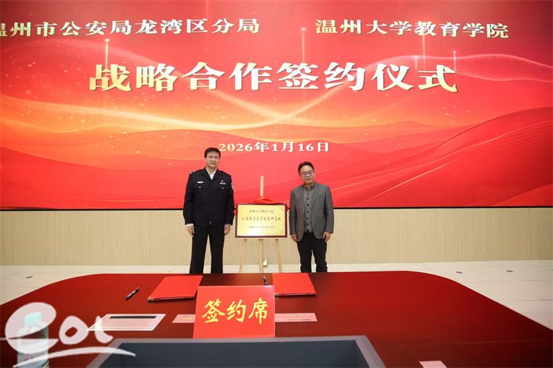 随后,双方共同签署《龙湾区公安分局与温州大学教育学院战略合作框架协议》,并为“龙湾区公安分局心理服务与人才培训合作基地”揭牌。根据协议,双方将围绕心理服务体系共建、教官培养与课程体系建设、警务人才梯队培养等重点领域开展系统合作。