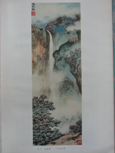 《大龙湫》,一九五八年为书画家范韧庵而作。此年佳作,还有《庐山小景》、《庐山五老峰》、《浙东小景》等,朱季海先生评介此阶段吴氏山水为:“几如庖丁之投刃皆虚,目无全牛,雅思不尽,无非合作。”正处于晚年创作的高峰期。此图青绿设色,状写实景,描绘大龙湫奔泻百米的壮观景象。山前绘芙蓉,满满当当占据了半幅画面,龙湫自山巅崖间倾泻,澹若轻云,落至崖底飘飘渺渺,已成水雾,图下以淡墨晕染出蒸腾水汽,类似手法我们可以在他后来著名的《庆祝我国原子弹爆炸成功》一画上端蘑菇云中唔见。对山水烟云之状的描绘,吴湖帆有自己一手绝活,如戴小京先生所述:“他作画时每以巨笔纵横挥洒,观者往往难窥其间径渭,而至其稍干,再用小笔淡墨加以渲染,在手法上大胆地采用一反前人的没骨烘染法。几度渲染后,虚实渐明,那留白之处经水墨濡化映衬成为浮动翻飞的云雾,呈现出一派空蒙迷茫的景象”。如此使用水墨,实在有些类似西画家运用水彩的技法,陆俨少因此批评吴画“笔不如墨,墨不如色”。换个角度看,其画在色彩晕染上确是另有创格的,青绿作品由《云表奇峰》(1936)始成熟,至五、六十年代之交佳作迭出,达至巅峰,《大龙湫》与《百丈漈》皆为这时期画作。