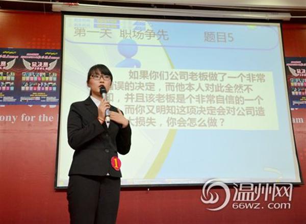 温州网讯 “许甜甜,加油!”舞台灯光聚焦在一位美丽阳光的女孩,台下观众兴奋的呐喊助威……5月9日晚,温州市第四届暨温州大学第十届职场精英挑战大赛决赛在温州大学雁山厅举行。23家企业代表参与决赛评审。