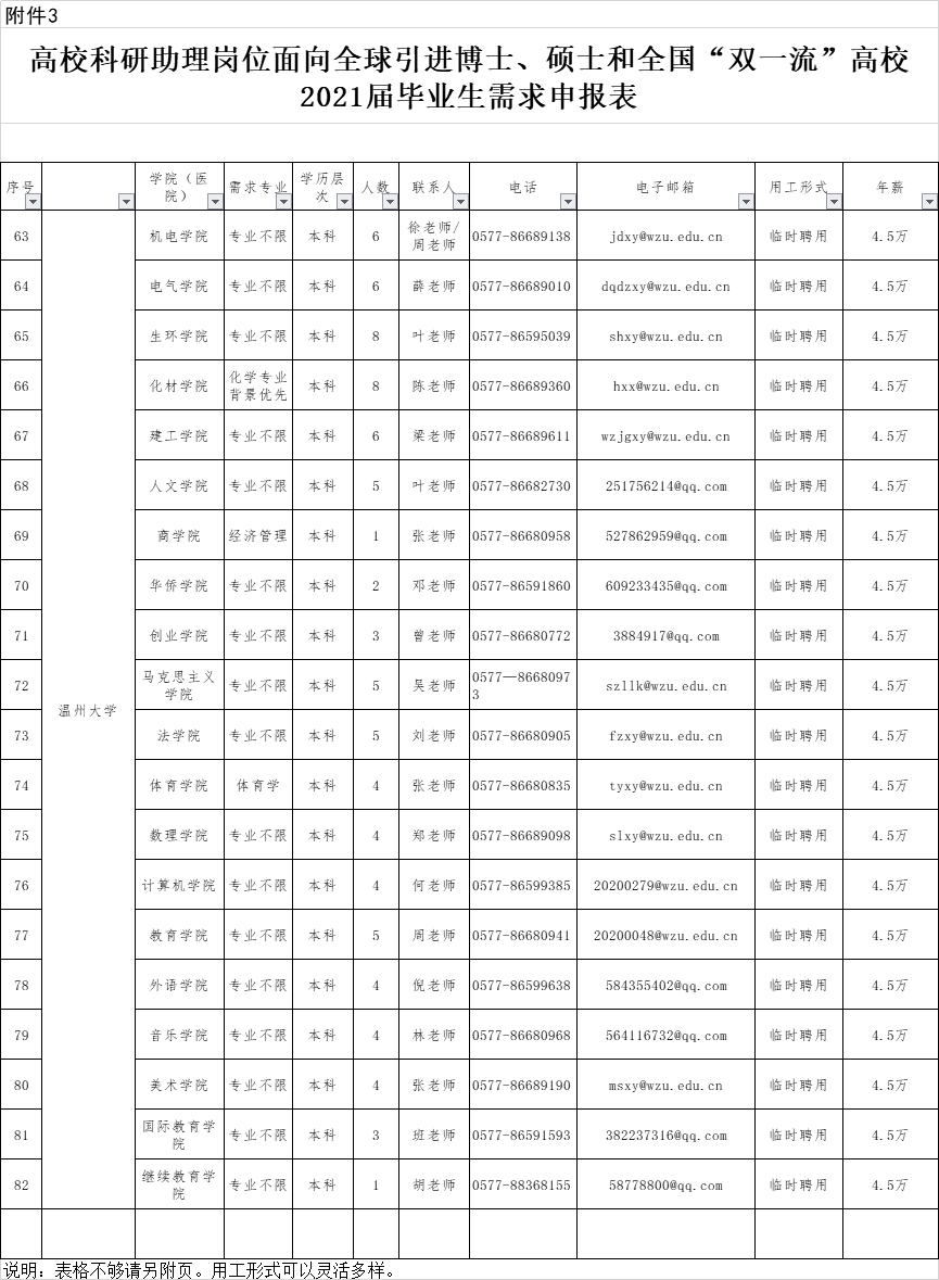 3.在温高校科研助理岗位面向全球引进录用博士、硕士和2021届优秀本科毕业生需求表