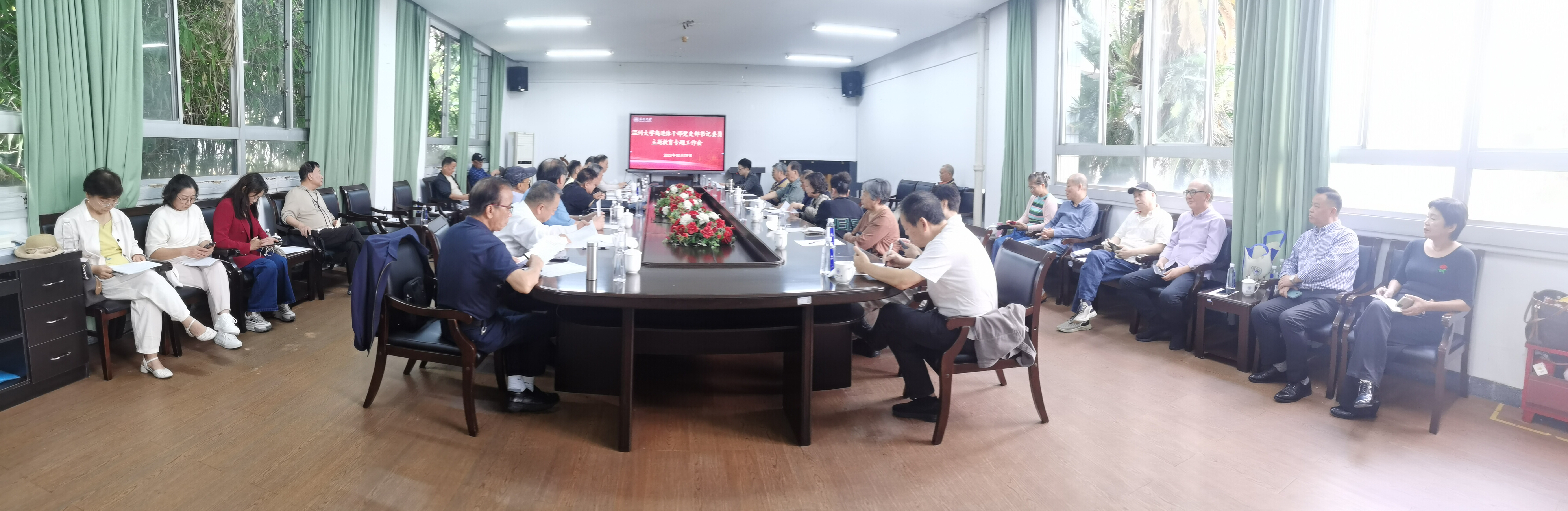 2023年10月19日上午,温州大学离退休党委在学院路校区老干部活动中心会议室召开离退休干部党支部书记委员主题教育专题工作会。三十余位离退休党支部书记、委员及离退休处全体工作人员参加会议。会议由离退休党委陈慧同志主持。