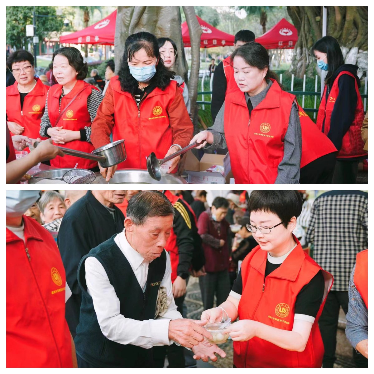 上午7点,温州大学离退休第十党支部十八位志愿者,整整齐齐地穿着红马甲,早早地来到红日亭活动现场。在红日亭义工队负责人的带领下,大家开启了有序的工作:拉横幅、搬桌椅、摆碗筷、煮汤圆等等,忙得不亦乐乎。此时,大榕树下已经排起长长的队伍。在贫困老人、环卫工人、残障人士们期待的目光中,大家把一碗碗热气腾腾的汤圆送到他们手中。他们回应的一张张灿烂的笑脸,让志愿者们内心激动不已。两个多小时的时间里,志愿者们一直没有停歇,直到五百多份汤圆全部赠送完毕。八十多岁的老党员陈秀士从一大早来到活动现场就开始认真维持活动秩序。虽然同志们几次劝他不要太劳累多歇歇,但是他始终坚持,直到活动结束才坐下来喘口气。温州大学老师们无私奉献的精神得到了红日亭义工队的一致称赞。