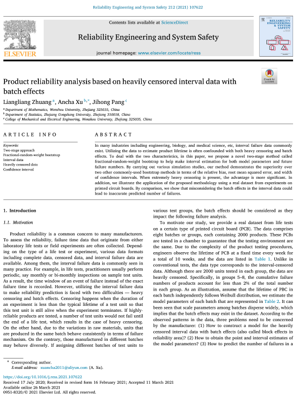 Zhuang Liangliang, a year-three postgraduate student studying applied statistics in the College of Mathematics and Physics published a paper titled "Product reliability analysis based on heavily censored interval data with batch effects" as the first author in Reliability Engineering & System Safety, an international journal in the field of system reliability and security that is ranked first-class by the Chinese Academy of Sciences, with Impact Factor of 5.04.