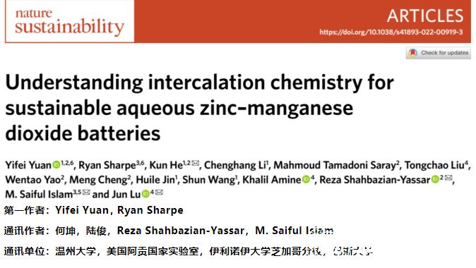 Recently, Professor Yuan Yifei and Associate Professor He Kun of Wenzhou University, in collaboration with the Argonne National Lab, the University of Illinois and the University of Oxford, have published a paper entitled "Understanding intercalation chemistry for sustainable aqueous zinc-manganese dioxide batteries" in the top international journalNature Sustainability.