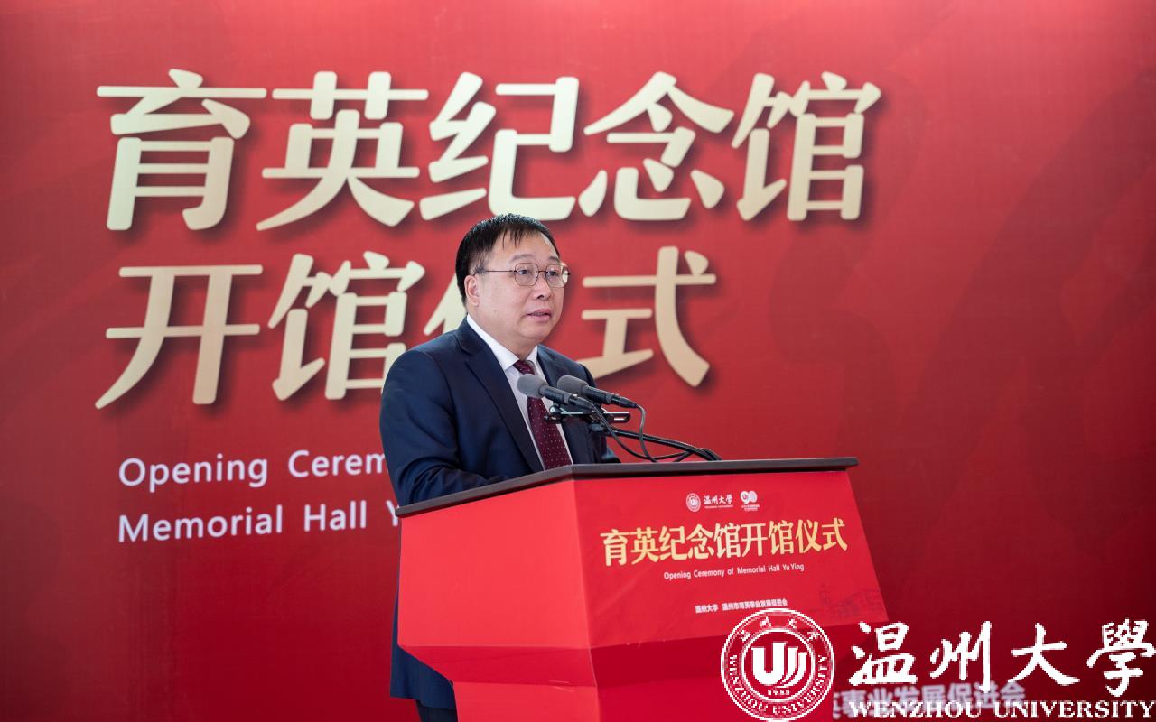 赵敏致辞。他介绍了何朝育先生与夫人何黄美英女士爱国爱乡、造福桑梓的事迹,对何氏家族为温州大学作出的贡献表示感谢。他表示,育英纪念馆将成为传承弘扬“育英精神”的有效载体,将极大推动社会公益慈善事业蓬勃发展。学校也将以此为契机,将育英纪念馆打造成为温大学子弘扬“育英精神”的新地标,教育引领温大师生积善成德、向善而行。