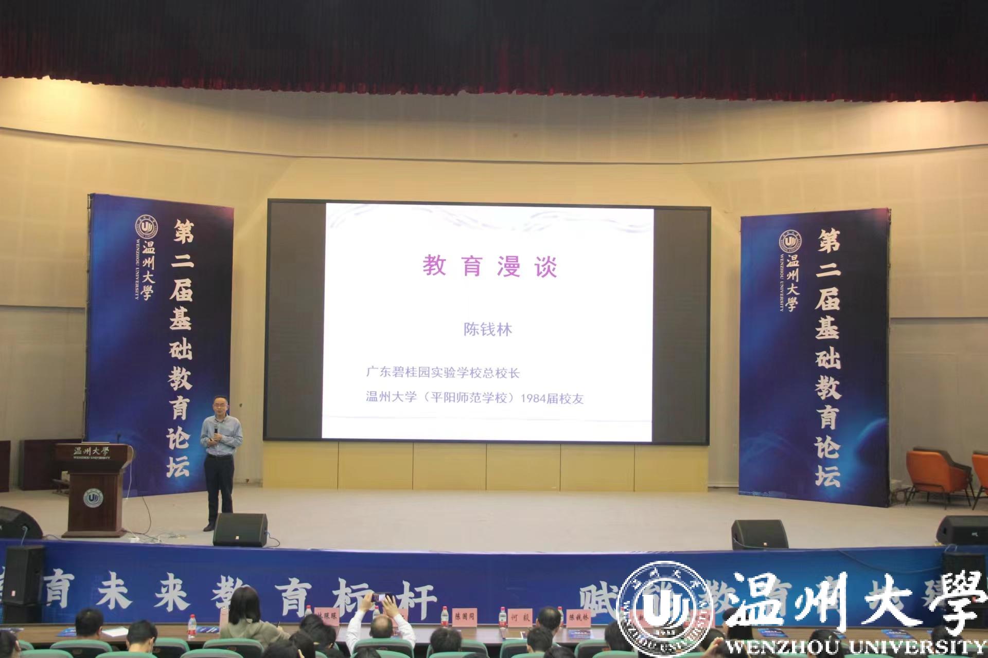 广东碧桂园教育集团区域总校长、温州市首批教育名家、浙江省第八届督学、长三角第七届最具影响力校长、温大教育学院84届校友陈钱林作《教育漫谈》主旨报告。